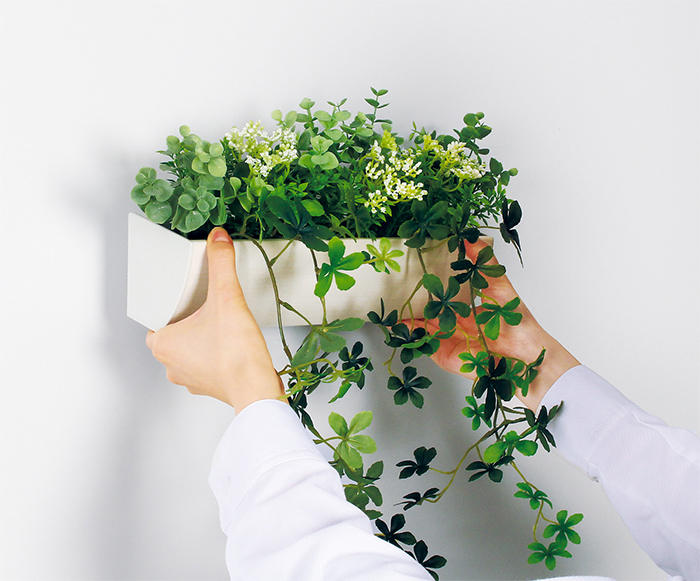 まるで本物みたいなフェイクグリーンをアレンジしたポット。裏面にマグネットがついているので、磁石のつく壁面やドアにペタッとくっつければOK。ビスや工具を使わず、本格的なディスプレイを実現します。
