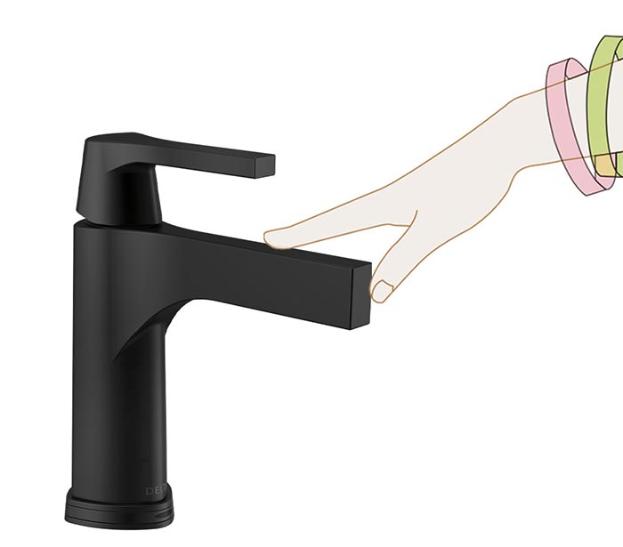 水栓金具の半径10cm以内に手を近づけると、静電気を感知してスイッチが入る「タッチ&センサーテクノロジー」。一般家庭ではもちろん、水栓に触れなくて良い点から、感染症の拡大防止等の観点で医療福祉施設でも活用が期待されています。[ DELTA(デルタ)についての説明はこちら ]